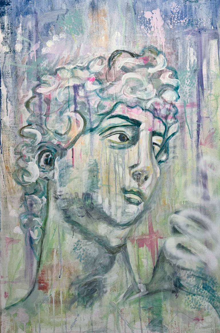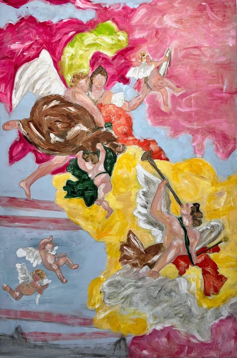 Inspiriert vom legendären Deckengemälde in der Würzburger Residenz von Giovanni Battista Tiepolo, entfaltet das Werk „Flug der Himmlischen“ von Tessa Becker ein kraftvolles Spiel aus Engelsfiguren, Farben und Dynamik. Die himmlischen Wesen, getragen von Wolken in Rosa, Gelb und Grün, strahlen Anmut, Harmonie und spirituelle Energie aus – ein moderner Dialog mit der barocken Opulenz.