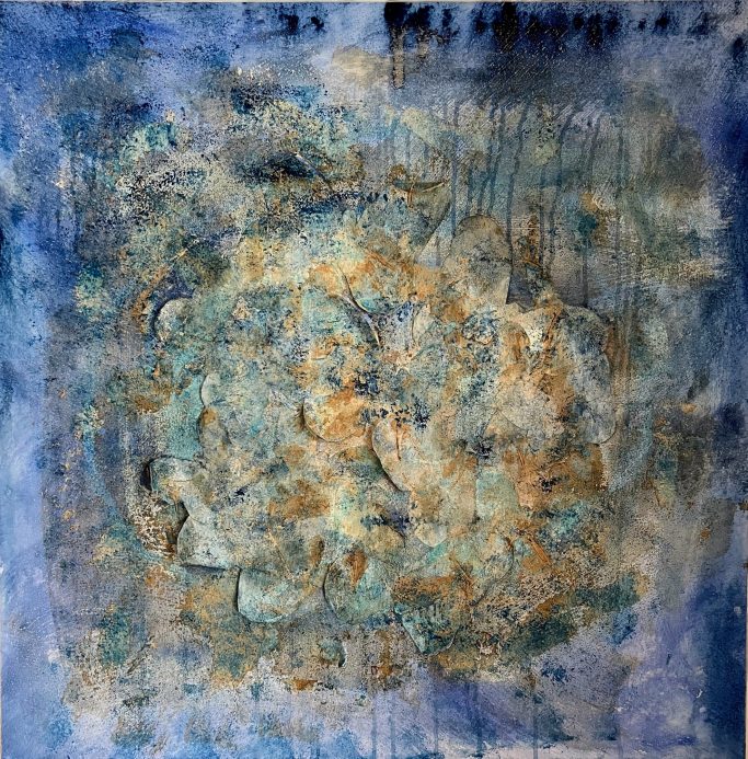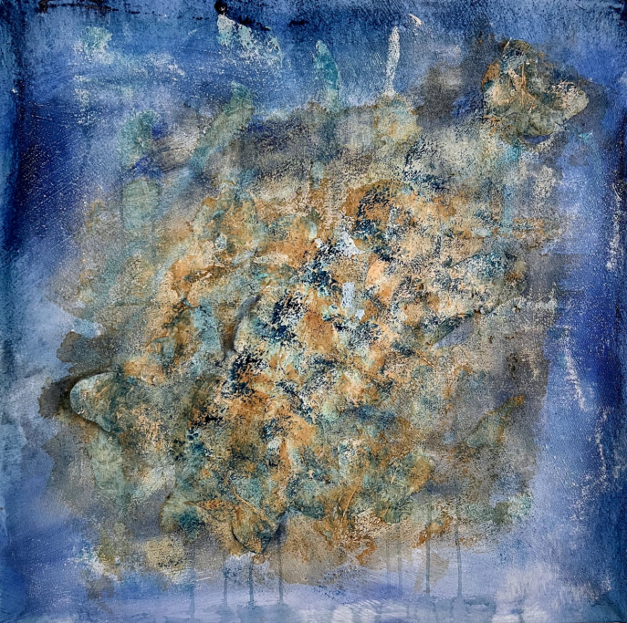 In „Flüsternde Flügel der Zeit“ vereint Tessa Becker erdige Farbstrukturen mit fließenden Blautönen zu einer Komposition, die an eine stille Reise durch Raum und Erinnerung erinnert. Die zarten Übergänge und dynamischen Texturen wirken wie verwehte Spuren vergessener Momente – vom Wasser getragen, in Bewegung gehalten durch den Wind der Zeit.