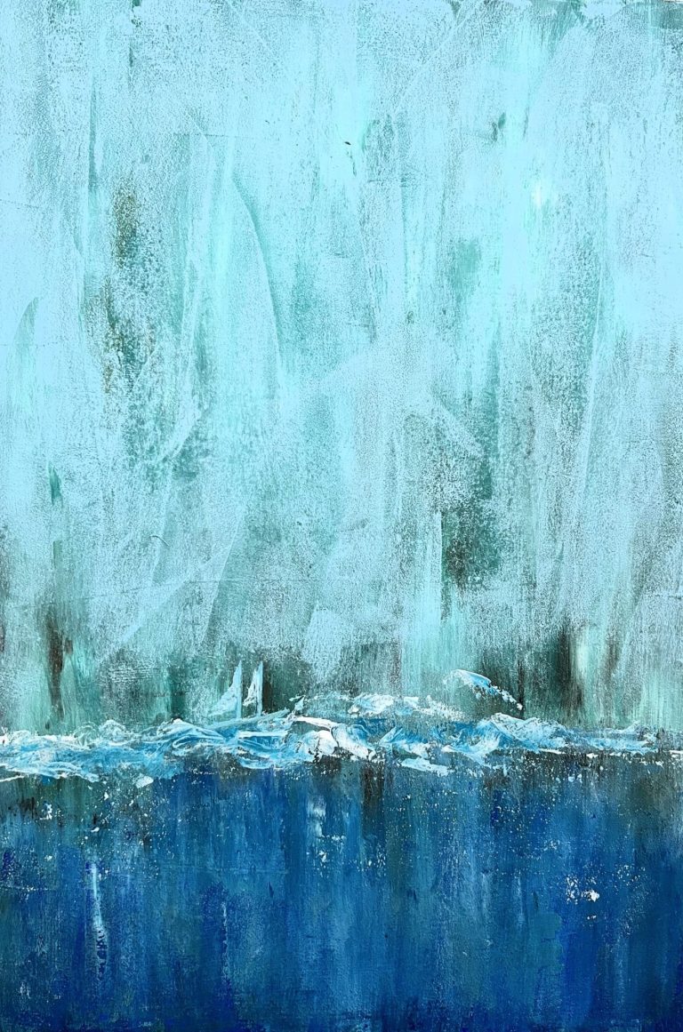 Mit beruhigenden Blautönen und fließenden Übergängen fängt „Meeresrauschen“ von Tessa Becker die meditative Kraft des Ozeans ein. Die dunkleren Wellen im unteren Bildbereich pulsieren in dynamischen Weiß- und Blauschattierungen, während die weiche Farbverläufe darüber an Himmel, Wind und die Ruhe nach dem Sturm erinnern. Das Werk verleiht dem Betrachter das Gefühl, mitten in der Bewegung des Wassers zu sein – abstrakt, sinnlich und träumerisch.