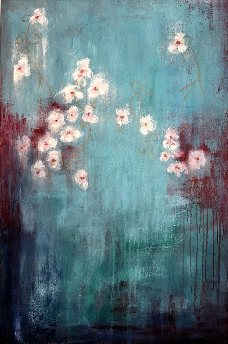 In „Im Fluss der Blüten“ lässt Tessa Becker weiße Blüten mit roten Zentren auf goldenen Ranken durch eine aquarellartige Szenerie aus Blau- und Rottönen gleiten. Die organischen Formen und fließenden Texturen erinnern an Wasser in Bewegung, wodurch das Werk eine meditative, fast poetische Ruhe ausstrahlt.