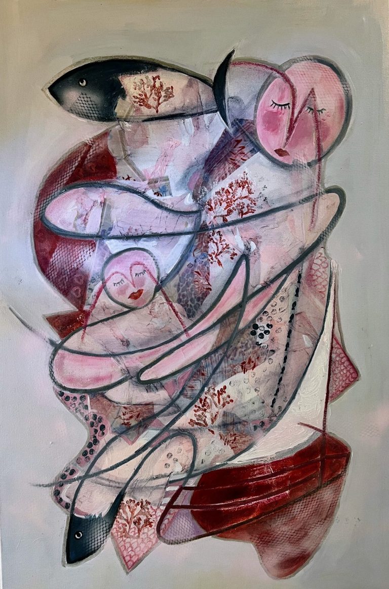 Mit expressiven Linien, kontrastreichen Farben und symbolhaften Elementen entfaltet „Im Herzen des Sturms“ von Tessa Becker ein fesselndes Zusammenspiel aus Bewegung und Reflexion. Zwei schwarze Fischgestalten umkreisen eine zentrale Figur – teils Mensch, teils Vision – deren rosa Gesichtsausdruck zwischen Gelassenheit und Auflösung oszilliert. Umgeben von floralen Mustern und netzartigen Strukturen entsteht ein visuelles Spannungsfeld, das inneres Erleben im Sturm der äußeren Kräfte spiegelt.