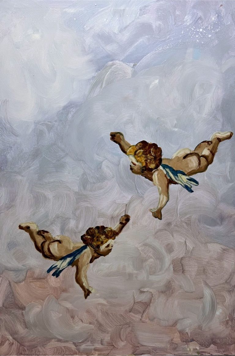 Zwei geflügelte Putten gleiten schwerelos durch ein Himmelspanorama aus sanften Pastelltönen – das Werk „Himmlische Leichtigkeit“ von Künstlerin Tessa Becker verkörpert Freiheit, Unschuld und die Leichtigkeit des Seins. Die flatternden blauen Bänder und die feinen Pinselstriche verleihen dem Bild eine träumerische Eleganz, die jeden Raum mit himmlischer Ruhe und positiver Energie erfüllt.