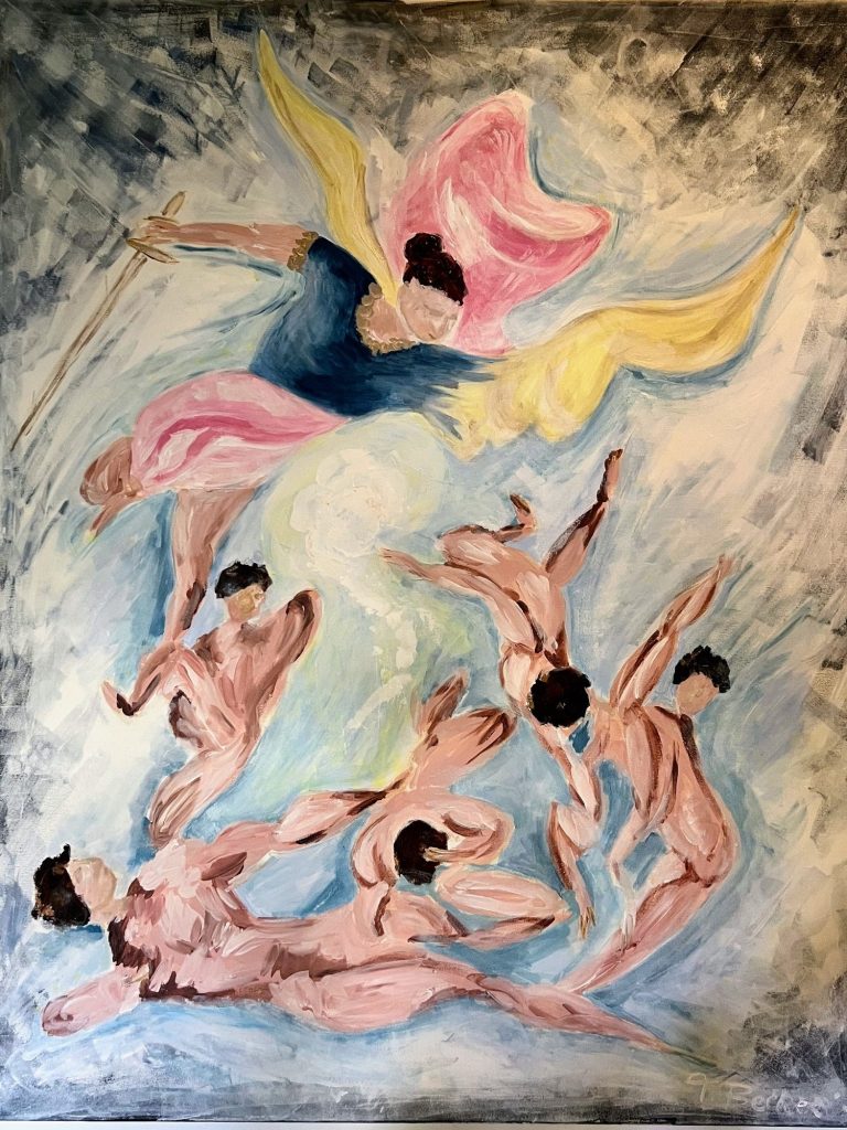 In Anlehnung an Sebastiano Riccis berühmtes Werk entfaltet sich in „Sturz der rebellischen Engel“ von Tessa Becker ein kraftvoller Moment göttlicher Entscheidung. Der Himmel öffnet sich zur Bühne einer himmlisch-irdischen Konfrontation: Engel mit goldenen Flügeln, stürzende Gestalten in expressiver Bewegung und vibrierende Farbkontraste verleihen dem Bild eine ungeheure Dynamik.