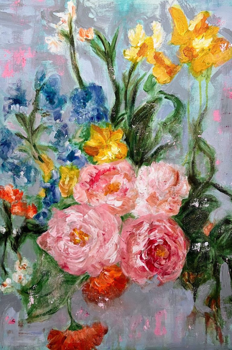 In leuchtenden Rosa-, Gelb-, Orange- und Blautönen entfaltet „Zeitlose Blütenpracht“ von Tessa Becker ein farbenfrohes Blumenmeer, das die Vergänglichkeit des Moments mit der Dauerhaftigkeit künstlerischer Schönheit verbindet. Impressionistische Pinselstriche lassen die Blüten auf dem grauen Hintergrund erstrahlen und verleihen dem Werk eine kraftvolle Tiefe.