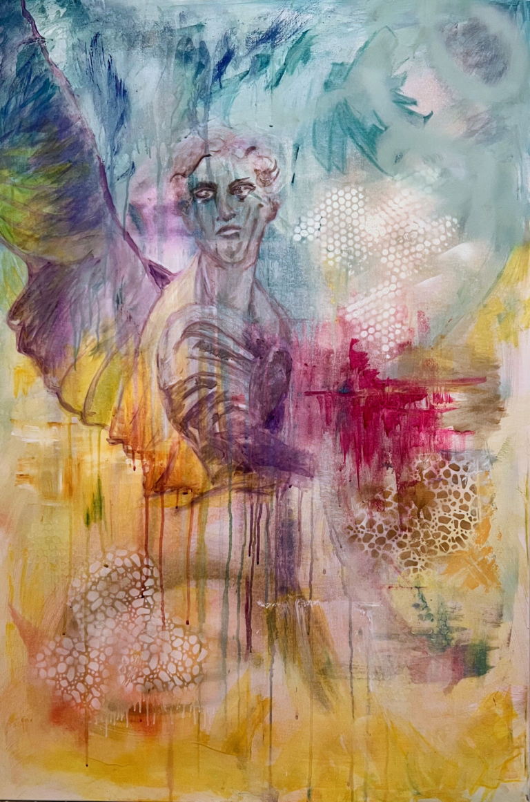 Mit ausgebreiteten Flügeln in leuchtendem Lila, Grün und Gold steht der „Engel der Verwandlung“ als Sinnbild für Transformation, Wachstum und die Kraft der Veränderung. Die fließenden Farbverläufe, kombiniert mit organischen Mustern wie Wabenstrukturen, verleihen dem Werk eine dynamische Tiefe und laden den Betrachter ein, sich auf eine Reise der inneren Wandlung zu begeben.