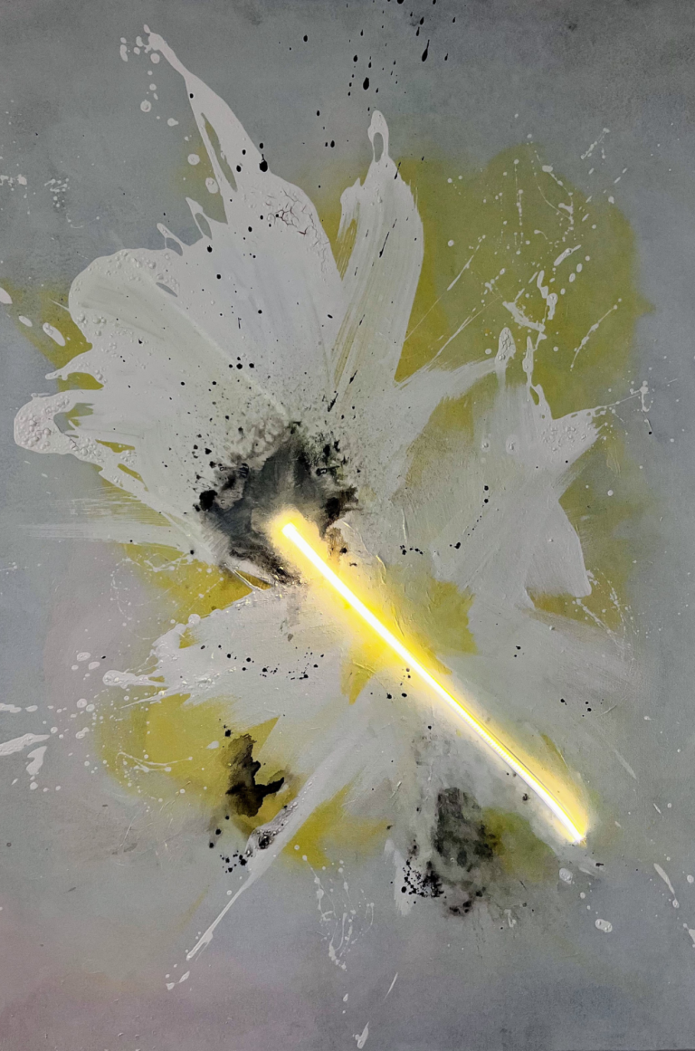 Tauchen Sie ein in die faszinierende Welt der zeitgenössischen abstrakten Kunst – dieses Werk von Künstlerin Tessa Becker besticht durch leuchtende Farben, kraftvolle Pinselstriche und eine energiegeladene Komposition. Besonders der strahlende LED-Lichtstrahl in Gelb verleiht dem Bild einen magischen Fokuspunkt.