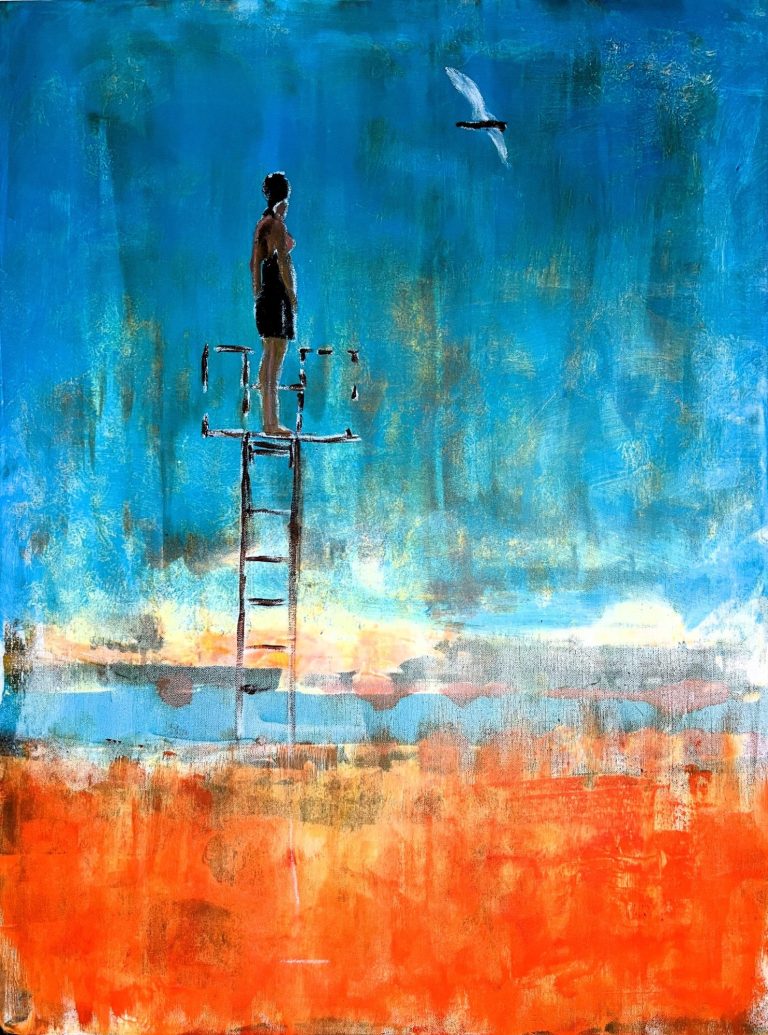 Mit einer ausladenden Leiter, die weit in den Himmel ragt, symbolisiert „Hoch hinaus“ von Tessa Becker den kühnen Aufstieg über Grenzen hinweg. Die dunkle Silhouette einer Figur auf der Plattform, der Flug eines Vogels im Himmel und die warmen Orangetöne im unteren Bereich erzeugen ein starkes Gefühl von Freiheit, Grenzüberschreitung und innerem Wachstum.